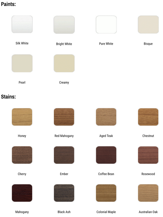 Don't get too hung up however with finding a perfect match. When sunlight reflects off the shutters it's difficult to notice any difference between shades on two different surfaces. Almost 95% of our customers choose a white or an off-white finish for their shutters over a dark stained finish. A bright surface will reflect more light into your room as well as giving a bright and uplifting appearance.