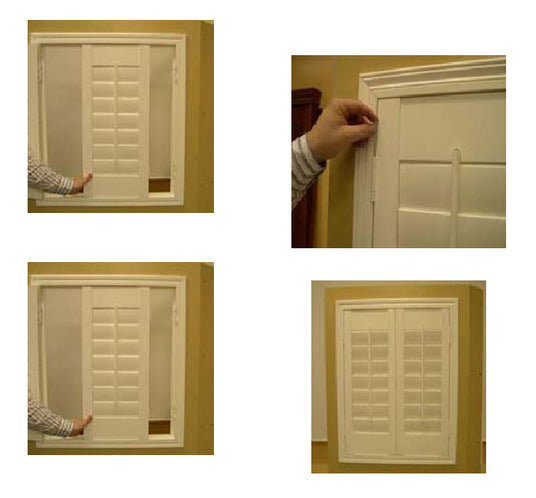 1.With the top left and right of the frame secured, place the left shutter panel(s) into the frame and slide it into place.